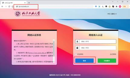 (2)连接NCUT访问外网时会默认弹出认证页面,在认证页面输入账号(学号或工号)和密码点击登录即可。若无法弹出认证页面,在浏览器地址栏输入ip.yazhoucrw.com即可打开。