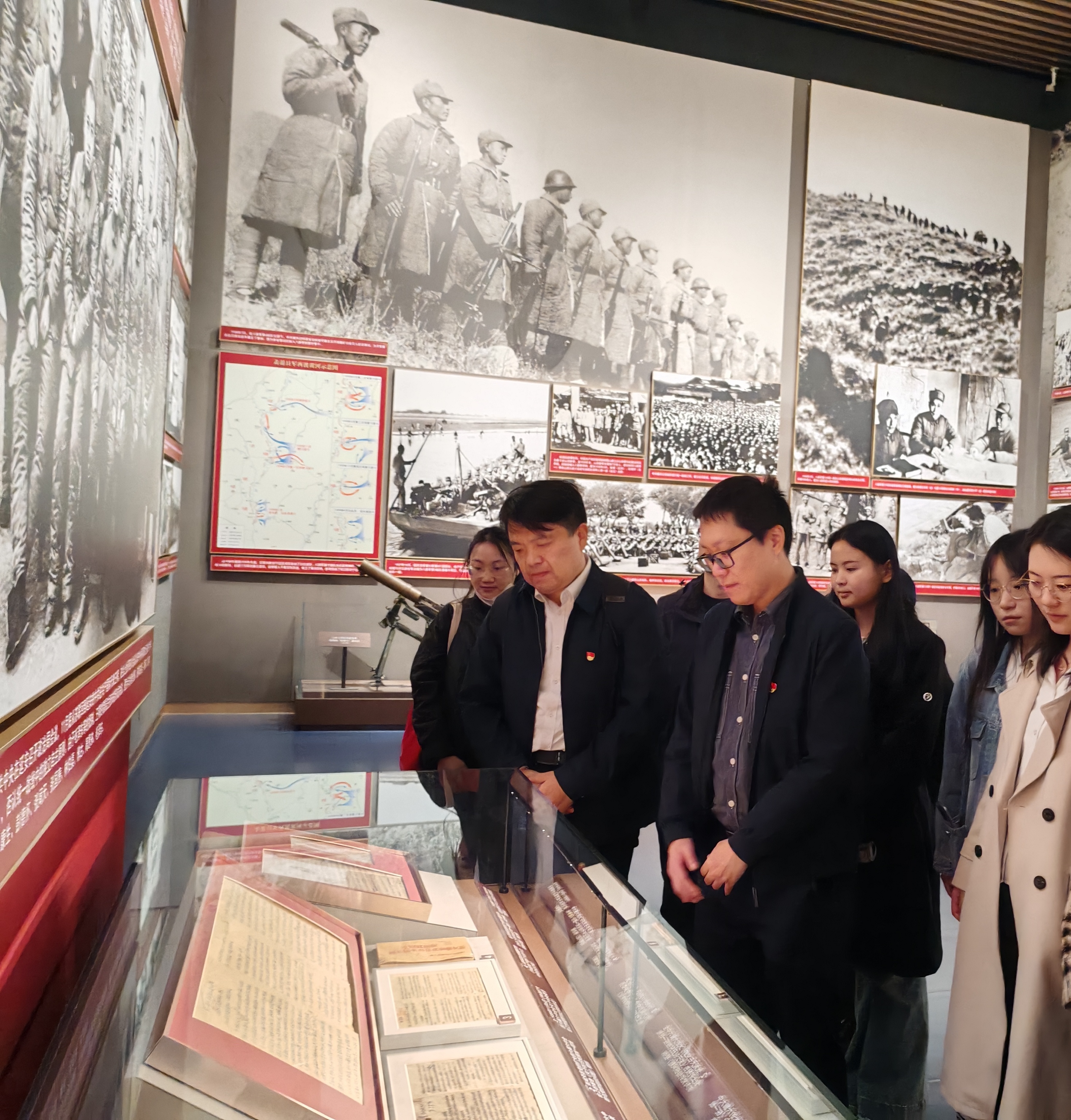在“新民主主义革命”展厅,师生们驻足凝视《共产党宣言》首个中文全译本,透过泛黄的书页感受马克思主义真理力量。“抗日战争”展区陈列的锈迹斑斑的步枪、弹孔密布的军旗,无声诉说着革命先辈为理想信念抛头颅、洒热血的赤胆忠心。