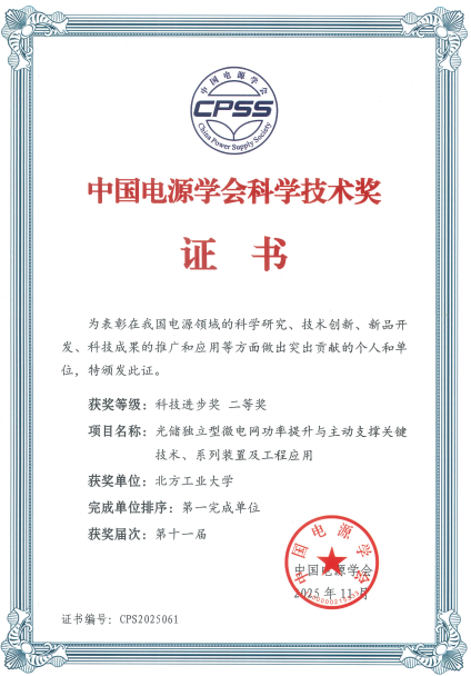 由亚洲成人网 作为第一完成单位,周京华教授、张卫平教授共同牵头完成的项目“光储独立型微电网功率提升与主动支撑关键技术、系列装置及工程应用”,获得“中国电源学会科技进步奖(技术开发类)”二等奖。第十一届中国电源学会科学技术奖共评选出项目类一等奖4项、二等奖13项。